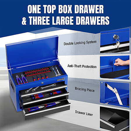 For 25 years, WORKPRO has adhered to its simple core value -- to support and encourage the "Can Do" attitude of its customers with high-quality, affordable tools that are among the most dependable performance tools on the market. WORKPRO is part of the family of companies of Hangzhou GreatStar Industrial Co., Ltd., a leading global developer, manufacturer, and supplier of tools found in over 100 countries throughout the world. Durable And Sturdy - This movable tool box is made of high quality SPCC steel with a blue coat paint finish to prevent damage and corrosion. It’s perfect for a garage or workshop. Large Storage Capacity And Detachable - The dimensions of the upper case is 19.3”X10" X13.2”, and the bottom cabinet size is 22”X11.6”X27.7”. The whole storage cabinet could be detached into 2 boxes. The upper case has a top drawer and two large drawers. You can be fulfilled with a variety of tools. And the top box is equipped with an anti-theft bolt that can help you safely store valuable tools. Movable Workbench - This lower cabinet can be used as a workbench, after removing the top toolbox. The bottom toolbox has more storage space for some large tools and equipment. And this top box can be placed in the bottom box from the side of it. Strong Universal Wheel - The tool cabinet is equipped with four durable universal wheels, two of which have non-slip locks. They can help you move the entire cabinet easily to fit more scenarios. Multiple Application Scenarios - This detachable tool cabinet is suitable for a variety of applications, such as a studio, garage, workshop, barbershop, etc.