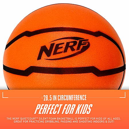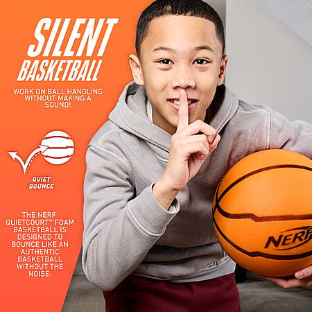 SILENT BASKETBALL: Bring basketball practice indoors without any of the noise! This NERF foam basketball is constructed to bounce just like a regular basketball while staying silent NEVER GOES FLAT: Because of it's foam construction, the NERF Quietcourt basketball doesn't need air so your game will never fall flat PARENT APPROVED: This indoor basketball is the perfect way to help kids practice their basketball skills right in the house while still maintaining some peace and quiet GREAT FOR KIDS: The NERF Quietcourt Silent Basketball is perfect for all kids and basketball lovers ages 3 and up!