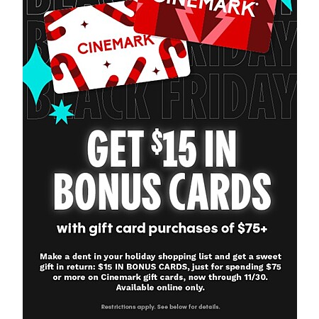 GET $15 IN BONUS CARDS: Offer valid Online Only Nov. 23–Dec. 30. Requires a total gift card purchase between $75-$500 to qualify. Maximum gift card purchases of $500. Bonus card valid only at concession stand only from 1/1/26 – 2/28/26. Limit one bonus card per transaction. Cannot be combined with Movie Club discount or any other offer or coupon. Not valid on Discount Combos, alcoholic beverages, or merchandise. Max value: $ amount stated on the Bonus Card. No cash back. Void if reproduced. Bonus card valid only 1/1/26 – 2/28/26.