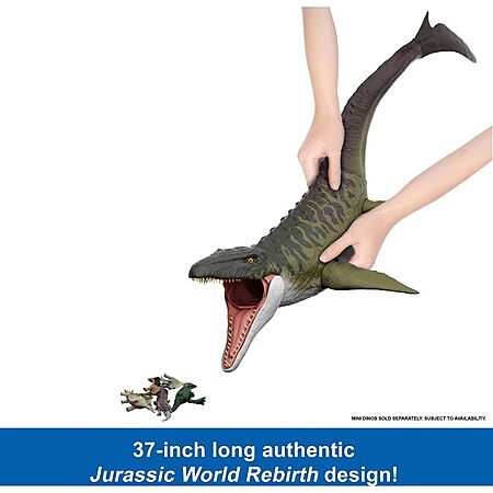 Huge scale! Bring the excitement and thrills of Jurassic World Rebirth home with this huge 37-inch long Mosasaurus action figure