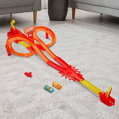 This set features Speed Snap Track for simplified track builds and includes an adapter that works with legacy Hot Wheels e-track.