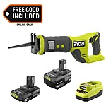 RYOBI ONE+ 18V Lithium-Ion Kit with 2.0 Ah and 4.0 Ah Batteries, Charger with ONE+ 18V Cordless Reciprocating Saw, $87, FS, Home Depot