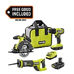 | Product Description: | RYOBI introduces the 18V ONE+ Cordless 2-Tool Combo Kit with 1/2 in. Drill/Driver, 5-1/2 in. Circular Saw, (2) 1.5 Ah Lithium-ion Batteries, 18V Charger, and Bag. The ONE+ Drill/Driver provides up to 515 in./lbs. of torque and features a 1/2 in. ratcheting metal chuck to match your drilling and driving needs. The ONE+ 5-1/2 in. Circular Saw has the ability to cut through 2-by material, with over 215 cuts per charge. The ONE+ 1.5 Ah Lithium-ion Batteries feature an integrated high visibility fuel gauge to monitor remaining runtime. The 18V Charger is compatible with RYOBI ONE+ Lithium-ion Batteries. Equipped with a 1 in. stroke length and 3,400 SPM this reciprocating saw is ideal for fast cuts through mutliple materials. The easy blade release lever ensures simple blade changes to quickly switch between cutting applications to complete over 145 cuts per charge. Best of all, this kit is part of the RYOBI ONE+ System of over 300 Cordless Products that all work on the same battery platform. Backed by the RYOBI 3-Year Manufacturer's Warranty, the 18V ONE+ 2-Tool Combo Kit includes (1) PCL206 18V ONE+ Cordless 1/2 in. Drill/Driver, (1) PCL500 18V ONE+ Cordless 5-1/2 in. Circular Saw, 18T Carbide Blade, Hex Wrench, (2) 18V 1.5 Ah Lithium-Ion Batteries, Charger, Bag, and FREE 18V Reciprocating Saw, 6 in. Wood Cutting Blade, and Operator’s Manual. |
