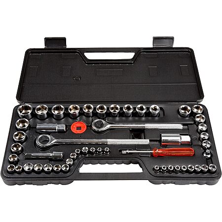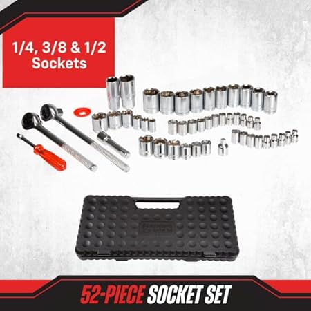 - 52-Piece Socket Set – This complete set of sockets is made of drop-forged steel with a chrome vanadium finish for a consistently accurate fit and long-lasting durability. The sturdy carrying case allows for easy organization and retrieval.