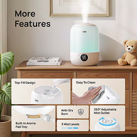 | Product Description: | 💧Large Capacity, Lasting Comfort The 3.7L humidifier features a convenient top-fill design and delivers up to 35 hours of continuous mist with just one fill. It eliminates the need for frequent refills and creates a soothing environment for bedrooms, nurseries, or offices. 💧Fine Mist, Wide Coverage Powered by ultrasonic technology, the humidifier releases ultra-fine 5μm mist that can rise up to 40" high. The 360° adjustable nozzle distributes moisture evenly, covering larger areas without leaving damp spots, ideal for large spaces. 💧Quiet Glow for Peaceful Nights The humidifier operates as low as 28dB, running as quietly as a gentle whisper. Its soft tri-color indicator adjusts with humidity levels, providing a calming glow that won’t disturb your rest while creating a comfortable atmosphere. 💧Precise Humidity Control With manual & auto modes and 3 mist levels, the humidifier uses a high-precision humidistat to maintain your ideal humidity within 5%. In auto mode, you can fine-tune the humidity in 5% increments for personalized comfort. 💧Safe & Worry-Free Use Built with Hall sensor, the humidifier monitors water level changes and automatically shuts off on low water or tank removal to prevent dry burn. Made with BPA-free materials, it's safe and reliable for the whole family. 💧Easy to Clean, Hygienic Water Use Wide top opening allows easy refills and cleaning. Includes a cleaning brush for dead-angle-free maintenance, reducing stagnant water and scale buildup for cleaner, healthier humidification. 💧Aromatherapy for a Soothing Atmosphere This humidifier features a built-in aroma pad tray that lets you add essential oils for a gentle, calming scent. It helps create a relaxing environment for babies and family alike, supporting restful sleep. 3.7L top-fill tank runs up to 35 hours per fill Mist reaches up to 40" high for wide, covers 300 ft² rooms 5µm ultrafine mist for soothing hydration ±5% precise humidity control with three-color dynamic RGB light Ultra-quiet operation at only 26dB LED display with mist level indicator Built-in aroma pad tray for essential oils Easy-to-clean design with removable parts Auto shut-off protection for safe use 360° adjustable nozzle for flexible mist direction Works with demineralization and clean mist cartridges What’s Included: 🧹Cleaning brush x1 📘 User manual x1 📄 Quick start guide x1 🌸Aroma pads x3 |