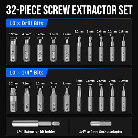 Compatible with Standard Drills: Includes 20 stripped screw extractors (Ex#1~#10, Dr#1~#10), 10 screwdriver bits, an extension shaft, and a socket adapter. It works with 3-12 mm screws and bolts, making it perfect for removing damaged, broken, or rusted screws and bolts