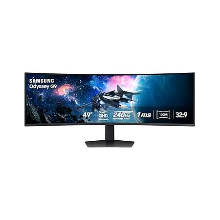 Experience immersive epic play with the G95C Odyssey Monitor, featuring a 49" screen with 1000R curve and Dual QHD resolution for full peripheral vision with maximum detail. 240Hz refresh rate, 1ms(GtG)* and AMD FreeSync™ Premium Pro gives you a competitive edge with hyper-fast action. VESA DisplayHDR 1000 brings nit peak brightness and 1,000,000:1 contrast ratio for intensified color and depth. CoreSync & CoreLighting+ enhance the space around your screen with amazing color. Ergonomic stand enables you to swivel, tilt, and adjust height to find your winning position. Picture-by-Picture and Picture-in-Picture offer versatility, while Auto Source Switch+ gets you to your gaming action faster. Adaptive Picture and Eye Saver Mode minimize eye strain, day or night. *"1ms" means one millisecond which is the range of average response time between 1.00ms to 1.99ms truncated to a whole number. Based on GtG measured under internal test conditions. Results may vary by content and monitor settings (requires 'Extreme mode' setting). GtG (Gray to Gray) measures the time taken for a monitor pixel to change from one gray value to another. **Image simulated for illustrative purposes. AMD FreeSync™ Premium Pro is supported by Radeon Rx 200 graphic cards and subsequent models.