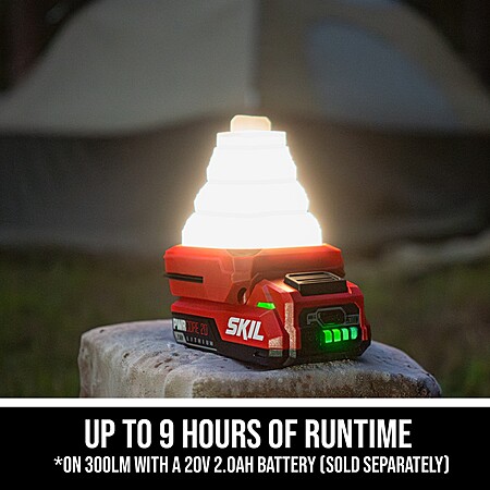 Whether you're camping or in need of a light that's easy to pack and take on-the-go, the SKIL 12V/20V Collapsible Lantern delivers up to 300 lumens of 360-degree illumination that collapses into a small footprint for easy transport and storage. It features a retractable hook for versatile mounting whether it's in a tent, from a tree branch, or under the sink. A USB-C out port allows you to power and charge devices while the lantern is in use.