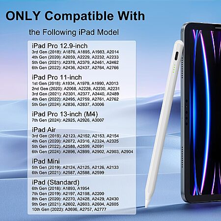- Stylus Pen for iPad 2018-2025: This stylus pen only works with iPad models released in 2018 or later. This pencil for iPad 11th/10th/9th/8th/7th/6th(2025,2024,2022,2021,2020,2019,2018); iPad Pro 11inch/12.9inch (3rd-6th Gen), 13inch(M4 2024); iPad Air 3rd/4th/5th Gen, M2 (2024) / M3 (2025) – 11" & 13" and iPad Mini 5th/6th/7th Gen (2025). NOTE: The Pencil is NOT compatible with iPad models before 2018, iPhone, Android and Microsoft devices. Please check your product model before placing an order. Go to Settings > General > About > Model Name before ordering!