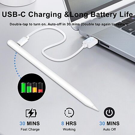 - 30 Minutes Auto-Shutoff Feature: Double-tap the top to power on/off (no Bluetooth needed). This pencil will automatically turns off after 30 minutes of continuous use (regardless of activity). Simply double-tap the top to restart. The LED indicator clearly shows the remaining battery: 3 lights (60–100%), 2 lights (20–59%), 1 light (<20%) – so you're never caught off guard