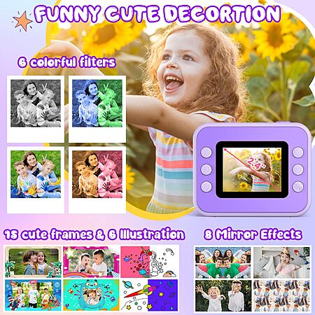Product Description from Amazon- Multifunctional Kids Instant Print Camera: This kids camera with instant print, 10X digital zoom, 2.4-inch large screen, flashlight, time lapse, brust shooting, DIY, MP3, 21 cute frames, 8 Mirror effects and 6 filters, etc. Which can meet the different needs of children. It is a good choice to accompany children to grow up happily. Bring a wonderful moment to you and your family.
