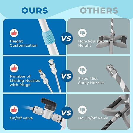 - Fully Adjustable Design: With 5 adjustable nozzles and a flexible 8M hose, you can direct the mist in any direction to suit your preferences. The height-adjustable design allows you to tailor the cooling experience to your needs. Moreover, the mister stand base is weighted to keep the unit in place and ensure that it doesn't move around.
