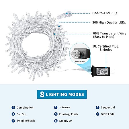 • 8 LIGHTING MODES & MEMORY FUNCTION - The multicolor christmas lights have 8 different lighting modes(combination, in waves, sequential, slo-glo, chasing/flash, slow fade, twinkle/flash, steady on)You chose the light modes by press the button button on the adapter, Besides,The Multicolor Christmas lights designed with memory function, It can remember the last mode you set before powered off. No bother to reset.