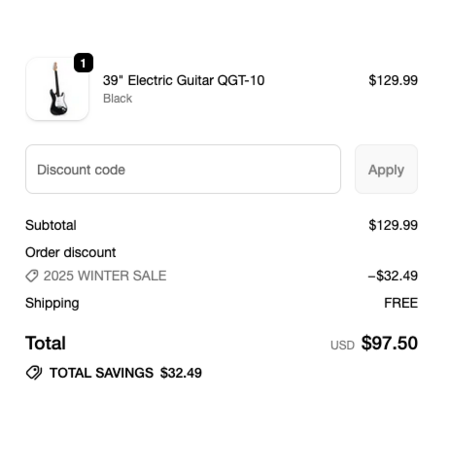 Sonicake [sonicake.com] has their 39" QGT-10 (strat-style) Electric Guitar in various colors for $97.50. Shipping is free. The price appears in cart.