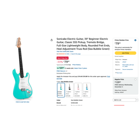 For those looking for the slickest deal on other Sonicake gear, be sure to check against Amazon on the pricing. Amazon is currently out of this Sonicake strat (and has been for about two months), but some of their other gear is both in stock and cheaper. For example, the sale price of the 30" Kids Guitar is $75.00 [sonicake.com] at Sonicake.com and $63.99(before tax) at Amazon [amazon.com].