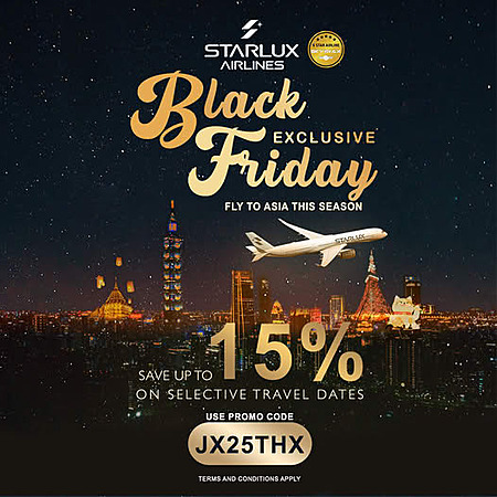 Starlux Airlines BFCMTT 15% Off Airfares to Asia from LAX ONT SFO SEA PHX - Book by December 1, 2025