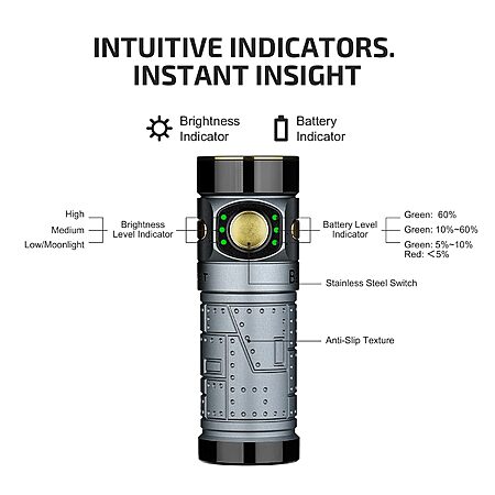[𝗧𝘄𝗼 𝗜𝗻𝗱𝗶𝗰𝗮𝘁𝗼𝗿𝘀] The handheld flashlight features a micro-perforated indicator that shows brightness and battery life. A digital display button on the case for precise battery level indication and brightness adjustment