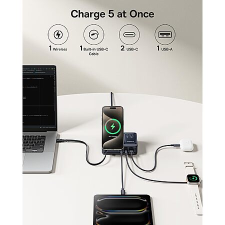 - 5-in-1 Desktop Charging Station: With 2 USB-C ports, 1 USB-A port, 1 built-in 100W retractable USB-C cable, plus Qi2-certified Magsafe wireless charger, allows you to charge up to 5 devices at the same time