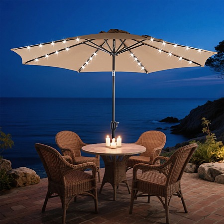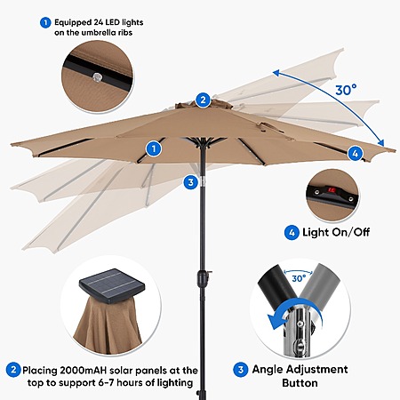 Model: edx 10ft Solar 32 LED Lights Patio Umbrella with Tilt Adjustment and UV-Resistant Polyester Fabric,Market Umbrella for Outdoor, Khaki