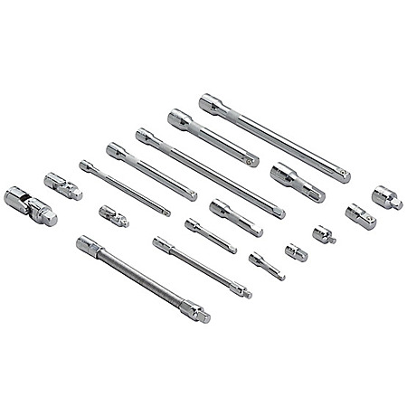 - Includes the following: (3) 1/4 in. drive extension bars: 2, 3, 6 in.; (3) 3/8 in. drive extension bars: 3, 6, 10 in.; (3) 1/2 in. drive extension bars: 3, 6, 10 in.; (1) 1/2 in. to 3/8 in. drive adapter; (1) 3/8 in. to 1/2 in. drive adapter; (1) 3/8 in. to 1/4 in. drive adapter; (1) 1/4 in. to 3/8 in. drive adapter; (3) universal joint: 1/4, 3/8, 1/2 in.; (1) 3/8 in. x 8 in. flexible shaft; (1) 1/4 in. x 6 in. flexible shaft