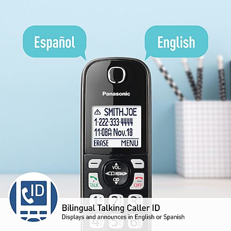 Voice Commands & Bilingual Talking Caller ID: Caller ID displays and announces in English/Spanish so you can know who is calling, even when you're across the room (add'l phone service); Voice Command lets you answer the cordless home phone hands-free