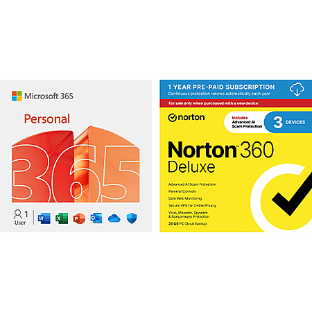 Microsoft 365 Personal 12 Month Subscription (1-Person) + Norton 360 Deluxe Security Software (3 devices) Digital Delivery $45 & More