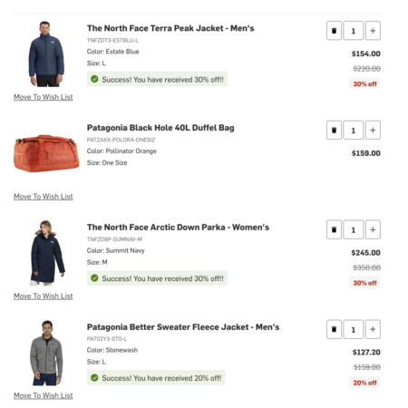 I just added a few jackets to my cart, it looks like it works on 1 Patagonia item and also multiple North Face Items.