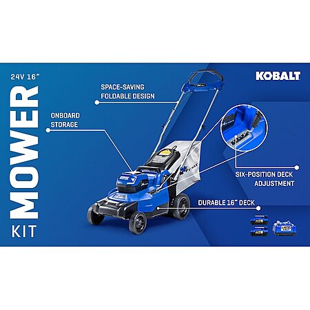 The average lawn size in the United States is 1/4 of an acre. Compact, lightweight, and easy to maneuver, we built this mower to handle smaller lawns with ease. Offering up to 48-minutes of cut time, the Kobalt 24V Brushless Lawn Mower provides superior performance without the noise, mess, and fumes of gas. The single lever deck height adjustment offers six positions (ranging from 1.5" to 4") allowing users to customize their cut. Additionally, the folding handles facilitate convenient and space-saving vertical storage. The included batteries and charger are compatible with all Kobalt 24-volt max tools and are backed by a 5-year warranty on the mower and a 3-year warranty on the batteries and charger.