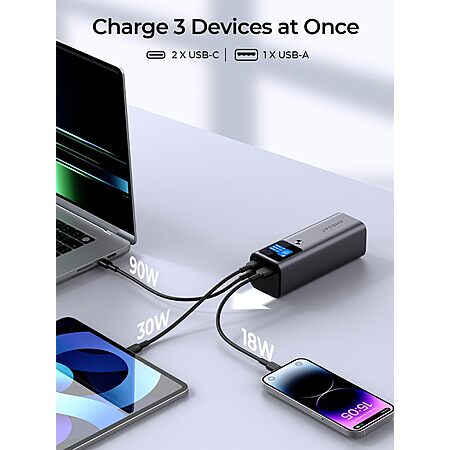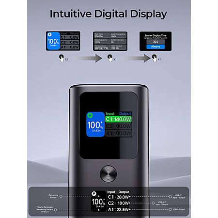 140W Fast Charging: With 140W PD 3.1 protocol output, it can power up 0-50% in 40 minutes for Macbook Pro 16". The impressive 140W input ensures the power bank fully charges within just 2 hours. Massive 27600mAh Capacity: Stores enough energy to charge iPhone 16 pro to 4.5 times, this power bank meets the charging demands of most laptops, it the perfect companion for air travel Charge 3 Devices Simultaneously: Equipped with USB-A and 2 USB-C ports, the portable charger lets you charge your laptop, phone, and tablet all at once. Intuitive Smart Digital Display: Keep track of your power bank's status effortlessly with the easy-to-read LCD digital display. It shows the output and input power levels, as well as the estimated time for a full recharge. Comprehensive Protection Features: Rest easy while charging your devices, as our power bank includes Entire Protect - a comprehensive protection system that guards against overcharging, overheating, overcurrent, overvoltage, short-circuits, and more.