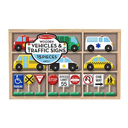 Amazon[amazon.com] has 15-Piece Melissa & Doug Wooden Vehicles and Traffic Signs (6 Cars and 9 Signs) for $11.99. Shipping is free w/ Prime or on $35+.