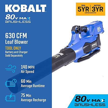 Kobalt 80v 630-CFM 140-MPH Cordless Battery Handheld Leaf Blower, tool only, $69, Lowe's