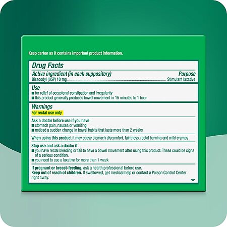 Includes: One (1) 28-count box of Dulcolax medicated stimulant laxative suppositories