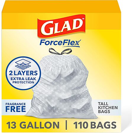 110-Count 13-Gallon Glad ForceFlex Tall Kitchen Drawstring Trash Bags (Fragrance Free) for $13.06 - 5% when you check out via Subscribe & Save =