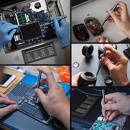 • 24 magnetic bits (Torx, Phillips, Flathead, Hex, etc), 4 pry tools, 1 magnetic mat, 1 magnet, and screwdriver