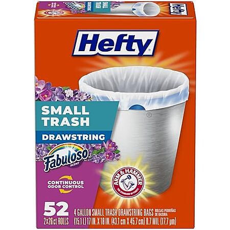 Amazon[amazon.com] has 52-Count 4-Gallon Hefty Small Trash Bags (Fabuloso Scent) 2 for $9.46 - 25% (multibuy discount) - 5% when you check out via Subscribe & Save = $7.80. Shipping is free with Prime or on $35+ orders.