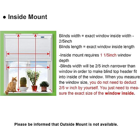 • Inside Mount ONLY. For better internal installation, a standard 2/5 inch deduction is made to the shade width. The actual blind size is 18 3/5" W x 36" H, the unique spring rod can extend 1 inch in total, allow the blind to fit for window width 17.7-18.6 inch, blind height can adjust from 0" to 36". (Pls Note) Minimum 1 1/5" depth of window frame required for inside mount.
