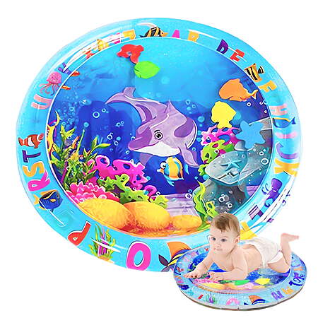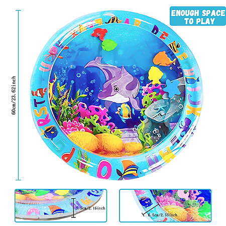 Stunning Eye Catching Graphics - Watch as your infant enters our fish tank Wonderland wide eyed and Fascinated by the bright colors sharp contrasts and cute floating toys Rain or shine is tummy time Your baby will try to catch and bat the brightly colored toys as they float by This baby splash pad will provide hours of quality stimulating and healthy fun