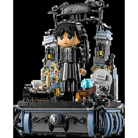 Welcome back to Nevermore Academy with this Wednesday & Enid's Dorm Room (76781) mystery and adventure playset for kids and fans aged 10 and up. The detailed LEGO® Wednesday Addams gift set features 4 collectible Wednesday and Enid Minidoll figures, the character Thing and a dorm room model. The room includes a cello, typewriter, mystery board, balcony with gargoyles, an opening window, a base with buttons to open hidden drawers and more. Inside the drawers you can store 2 of the Minidoll figures, along with accessories that include a cat-ear headpiece and Enid's phone.