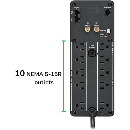 • 10 Outlets (NEMA 5-15R): 6 surge protector with battery backup; 4 outlets with Surge Protection Only