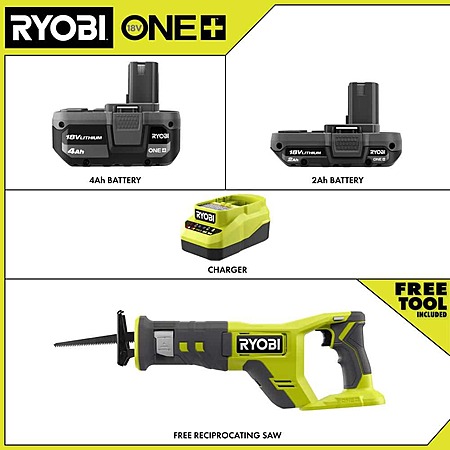 Ryobi ONE+ 18V Lithium-Ion Kit with 2.0 Ah and 4.0 Ah Batteries, Charger with ONE+ 18V Cordless Reciprocating Saw $89