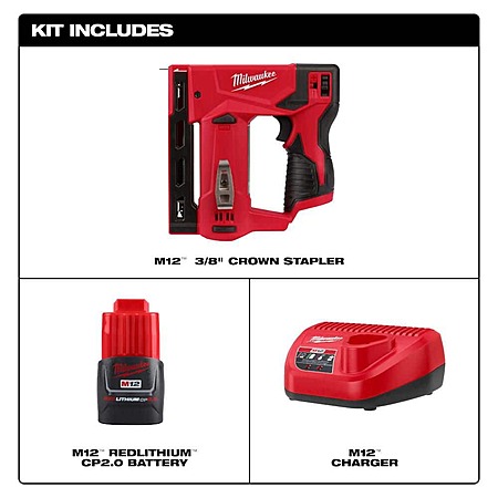 Model: M12 12-Volt Lithium-Ion Cordless 3/8 in. Crown Stapler with Compact Battery Pack 2.0Ah and Charger Starter Kit