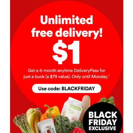 6-month Anytime Delivery DeliveryPass for $1 for select customers when promotion code BLACKFRIDAY is entered at checkout. Offer code is valid for a maximum of one redemption only and may not be combined with any other promotion code. Offer expires at 11:59pm ET, 12/1/2025.