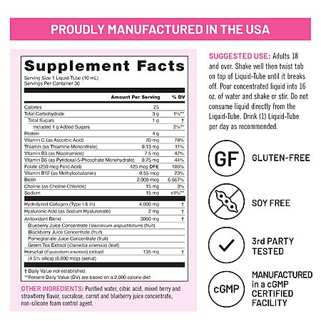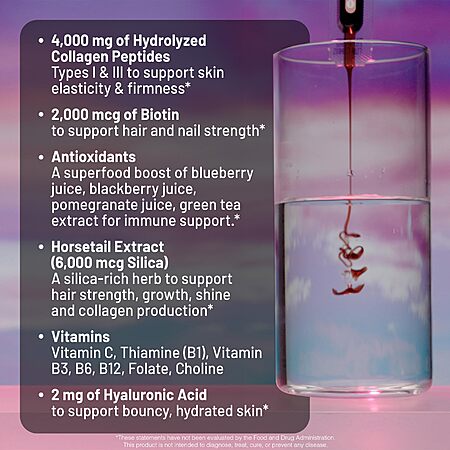 - BEYOND BIOTIN: This liquid collagen includes 2,000 mcg of biotin to support hair and nail strength, plus Vitamin C for collagen synthesis, Thiamine (B1), Vitamin B3, B6, B12, Folate, and Choline for additional aging support.*