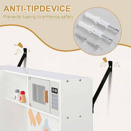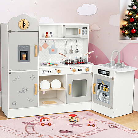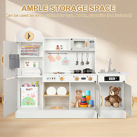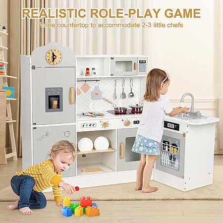 | Product Description: | Wisairt wooden kitchen play set is safe, sturdy, and fun for kids. It is made from eco-friendly, non-toxic wood with a smooth finish and quality paint. The set includes a rotating faucet with a water cycle, oven, stove, cooking utensils, and a chef's costume. Kids can enjoy pretend cooking while building motor and social skills. It's big enough for 2–3 children to play together and has storage space to help keep things tidy. Wooden Kids Kitchen Playset: Made of eco-friendly, non-toxic wood with a smooth, durable surface, coated with high-quality, odor-free paint to ensure children's safety. Rich Accessories: Comes with a children's chef costume (apron + hat) and a variety of realistic kitchen utensils and play food, making pretend play more vivid and fun. Complete Equipment: Features an electric sink with a rotating faucet, oven, stove, and more, with simulated cooking sounds and lights to enhance the play experience. Social Interaction: Perfect for 2–3 children to play together. Encourages them to take orders, cook in a pretend restaurant, and role-play as waiters and customers to build teamwork skills. Educational Toys: Helps children develop fine motor skills, logical thinking, and language skills while fostering good organizing habits. Specifications: Brand: Wisairt Material: Wood Color: Pink / Gray Product Size: 51.2 x 11.8 x 39.4 in Package List: 1 x Play Kitchen Set 1 x Chef Hat 1 x Chef Apron 1 x Assembly Instructions Note: 1. Play kitchen's colors may look different depending on lighting or screen settings. 2. Batteries are not included. Please contact us if any parts are missing or for installation help. 3. Slight odor may occur after opening due to long storage in a sealed box. Place in a ventilated area to air out. 4. Use the correct screw size to prevent breakage. When assembling, align the screws with the holes to avoid damaging the wooden board. |