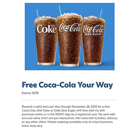 Sonic Drive-In: Any Size Coca-Cola Your Way w/ Unlimited Add-Ins Free w/ $1+ Purchase.