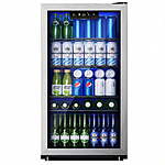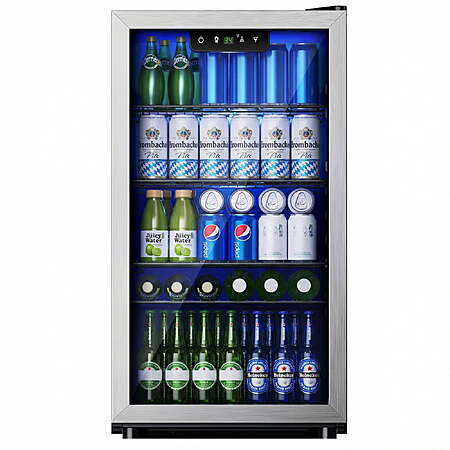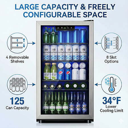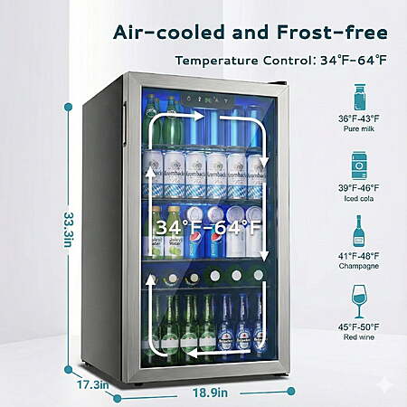 | Product Description: | Transform how you enjoy beverages with the EUHOMY 125 Can Beverage Refrigerator. More than a fridge, it’s a lifestyle upgrade—perfect for home bars, offices, game rooms, or entertainment spaces. Organize drinks, snacks, and specialty beverages with a flexible layout, while its sleek modern design blends seamlessly into any décor. Whether hosting friends, keeping refreshments at hand during work, or creating a convenient minibar, this fridge ensures your drinks are always ready, accessible, and visually appealing. With EUHOMY’s commitment to quality and effortless operation, it delivers style, convenience, and premium refreshment for every occasion. ADVANCED COOLING: Keep beverages at the perfect temperature with a 34°F–64°F range. The 360° air-cooled system ensures even distribution across all shelves, so every can or bottle stays consistently chilled. Whether for wine, beer, soda, or sparkling water, enjoy drinks exactly as intended every time. CUSTOMIZABLE STORAGE: Four removable shelves with eight slot positions allow you to tailor the interior for cans, bottles, snacks, or specialty drinks. Quickly adjust the layout for parties, movie nights, or office gatherings. The 3.2 cubic feet interior maximizes storage while keeping items accessible and organized. LARGE CAPACITY: Store up to 125 cans without compromising space. Despite its generous capacity, the fridge’s sleek 17.3"" D × 31.5"" H footprint fits seamlessly in kitchens, living rooms, game rooms, or offices, giving you variety and convenience in a compact, stylish package. LED INTERIOR LIGHT & TOUCH CONTROL: Bright LED lighting illuminates your drinks for quick selection, even in dim rooms. The intuitive touch panel allows accurate temperature adjustments, while energy-efficient LEDs enhance both functionality and modern aesthetics. USER-FRIENDLY DESIGN: Designed for effortless use with a reversible door, adjustable feet, and built-in handle. Whisper-quiet 36dB operation and auto-defrost function provide maintenance-free convenience. This mini fridge combines reliability, ease, and premium cooling performance for everyday use. |