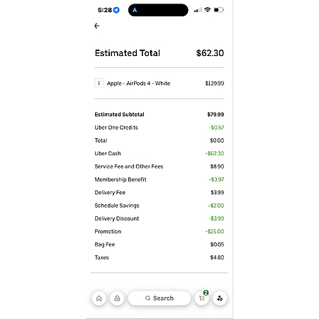 Just scored a killer deal on Apple AirPods 4—only $43.99 plus tax! The original price was $79.99 on Best Buy via Uber Eats, but I stacked a $25 promo and paid using a discounted Uber gift card (20% off), bringing the total down to $43.99 before tax. This was a legit Best Buy listing, delivered straight to my door through Uber Eats. If you're looking to upgrade your earbuds, this is one of those rare chances to grab premium gear at nearly half the price. Act fast—these kinds of deals don't stick around