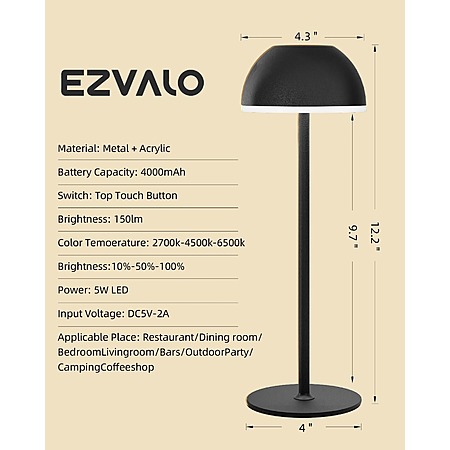 Prime Members: 2-Pack EZVALO Rechargeable USB-C Cordless Table Lamps w/ 3 Temps