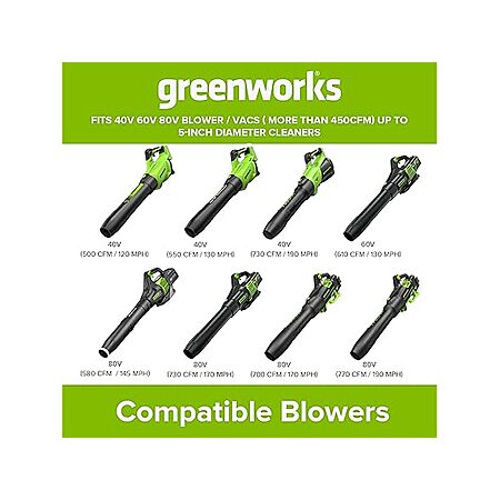 • Fits 60V 80V of blower/ vacs ( more than 450CFM) up to 5-inch diameter