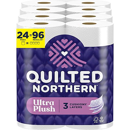 - Each pack contains 24 Mega Rolls of Quilted Northern Ultra Plush toilet paper for long-lasting softness